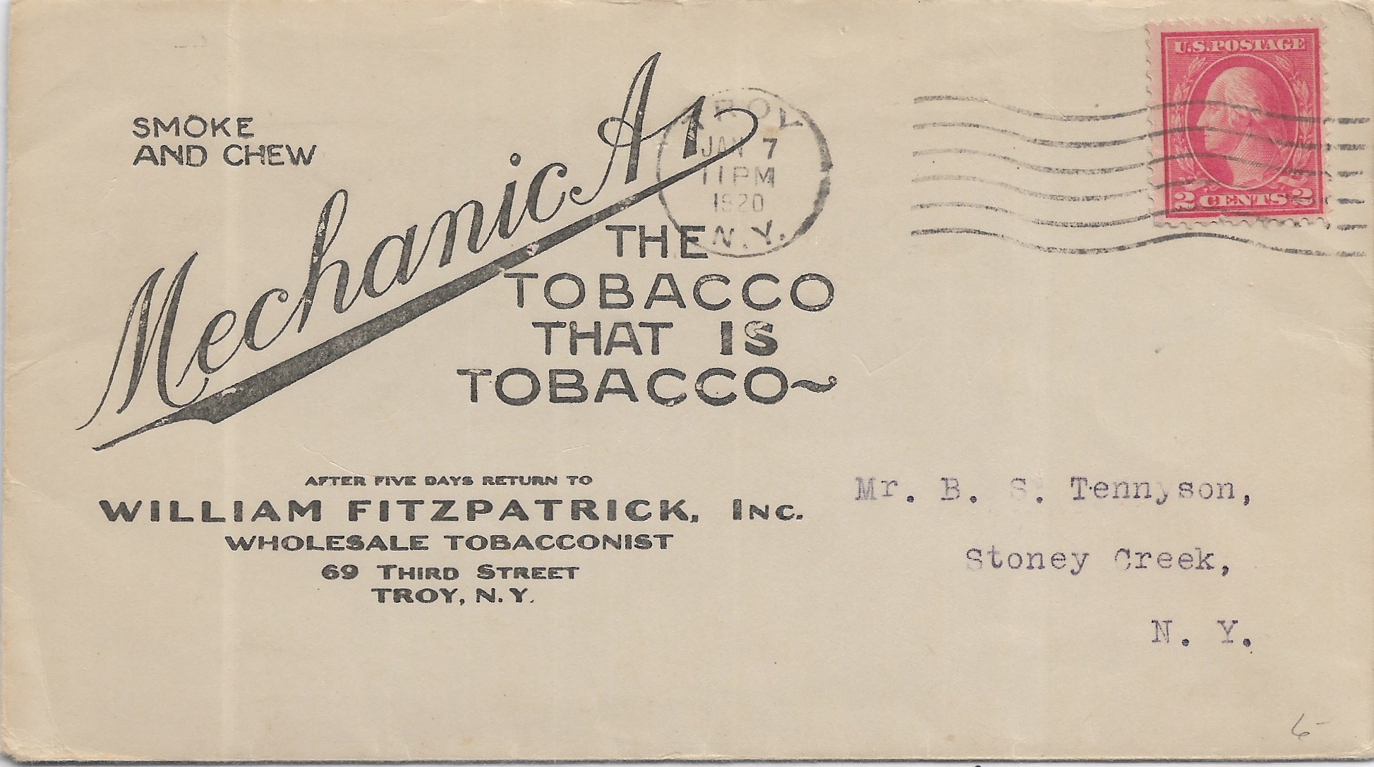 Advertising: 1920 Mechanic Tobacco, Troy to Stoney Creek, NY. Added Sunday, November 16, 2025