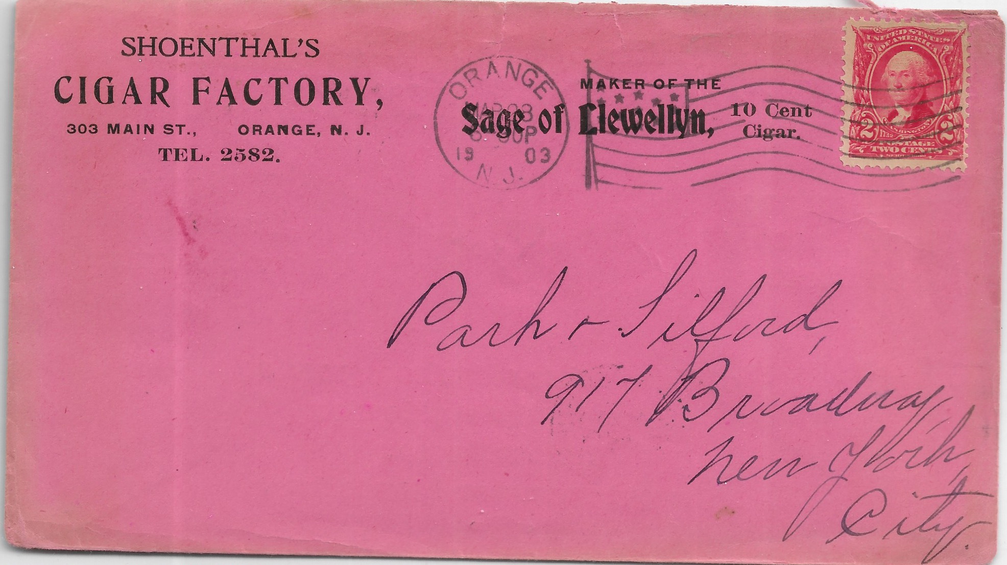 Advertising: 1903 Shoenthal's Cigar Factory, Orange, NJ to New York, NY. Added Sunday, November 16, 2025