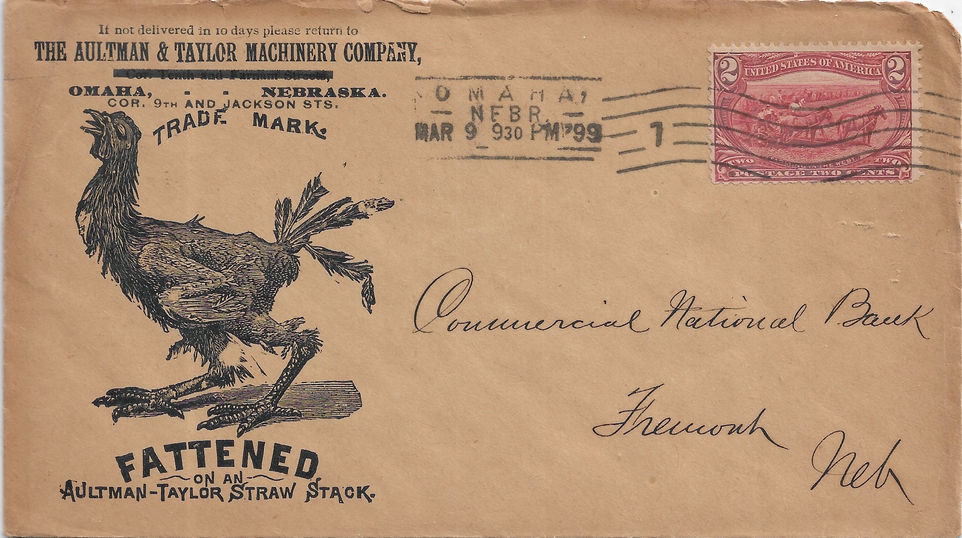 Advertising: 1899 Aultman & Taylor Machinery, Omaha to Freemont, Ne. back stamped Freemont. Added Sunday, November 16, 2025