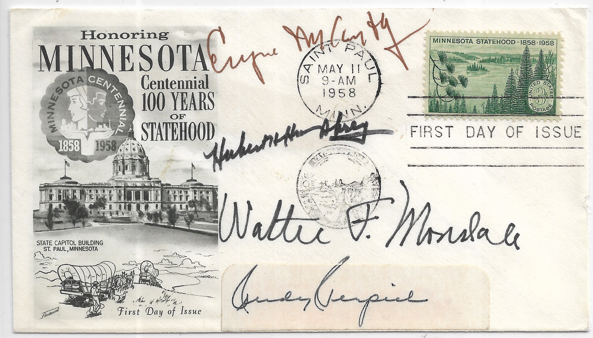 1958 3c Minnesota Centennial FDC signed by McCarthy, Humphries, & Mondale. Added Sunday, November 16, 2025
