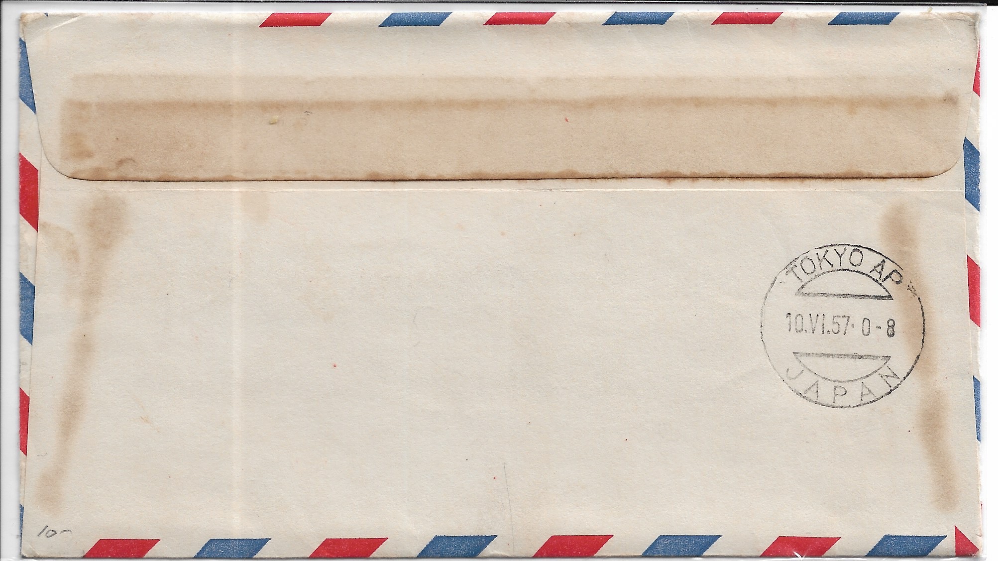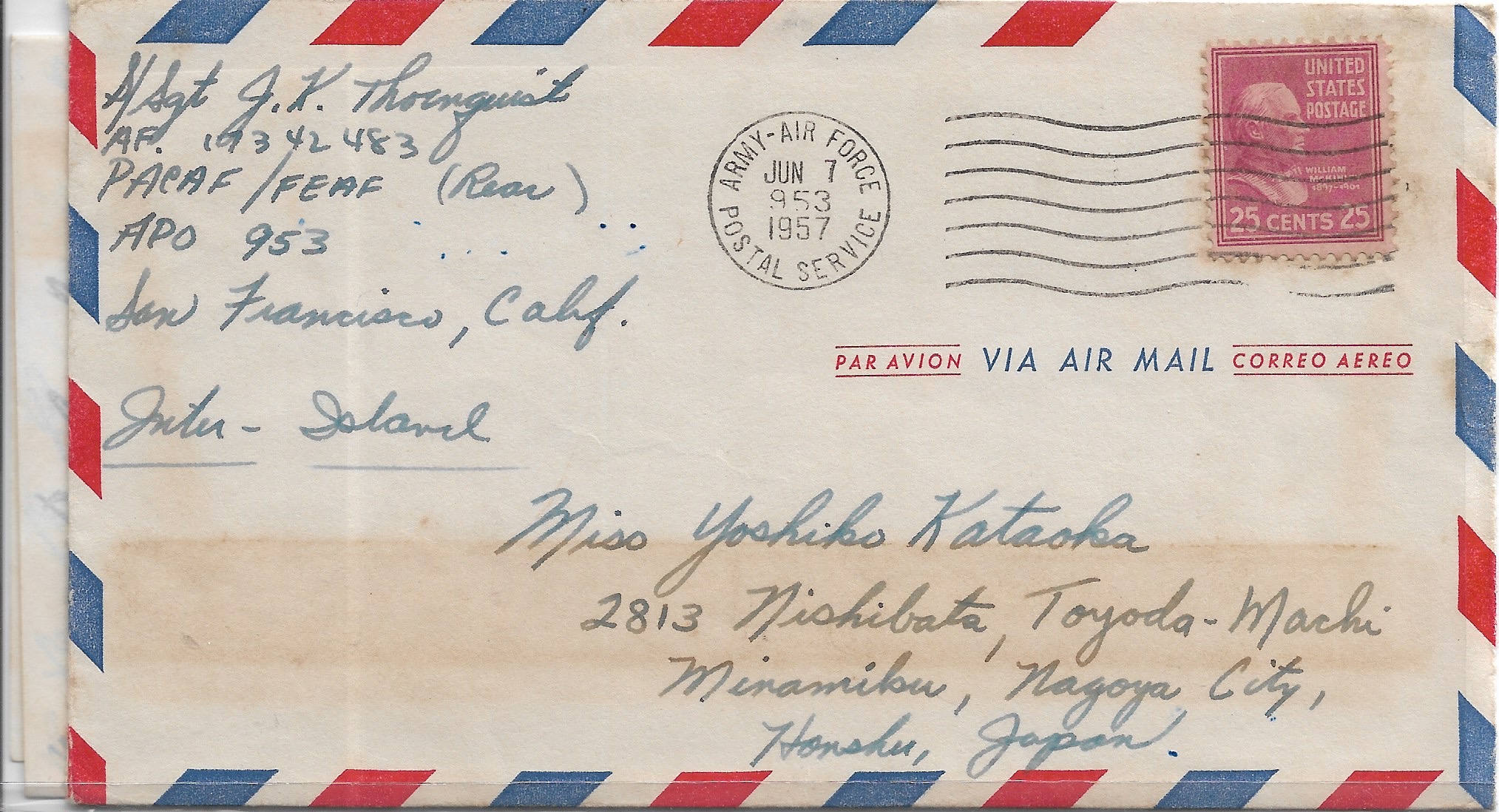 Korean War: 1957 APO 953, Japan to Nagoya City, Japan Airmail solo 25c Prexie w/Letter. Added Friday, September 19, 2025