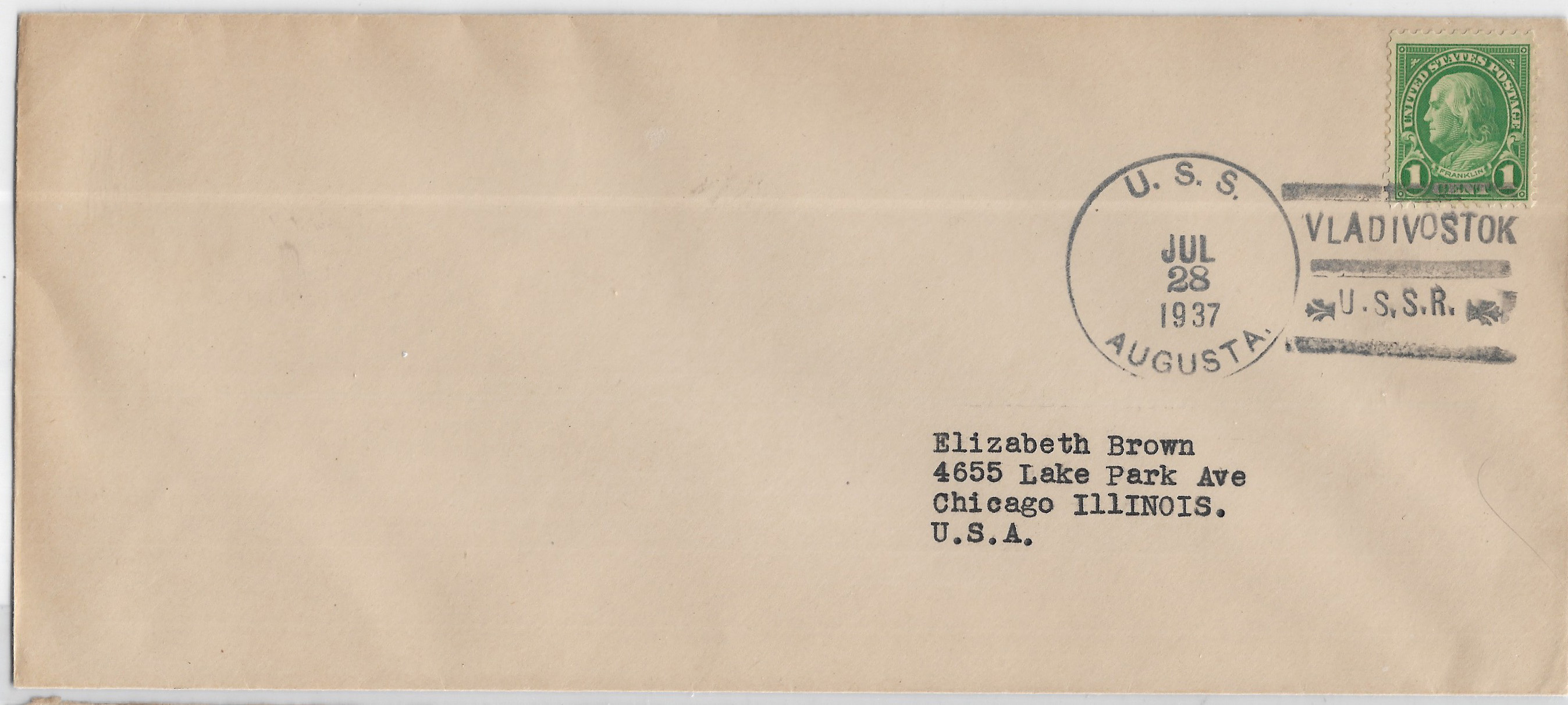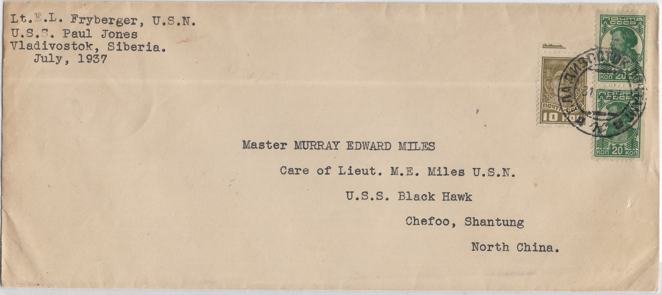 1937 USS Paul Jones DD-230, Vladivostok, Siberia to USS Black Hawk, Chefoo, China (h/K). back stamped Chefoo. Added Sunday, November 9, 2025
