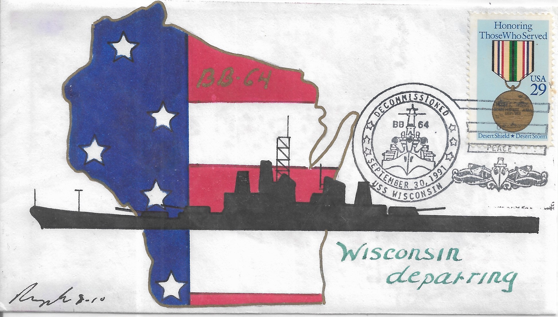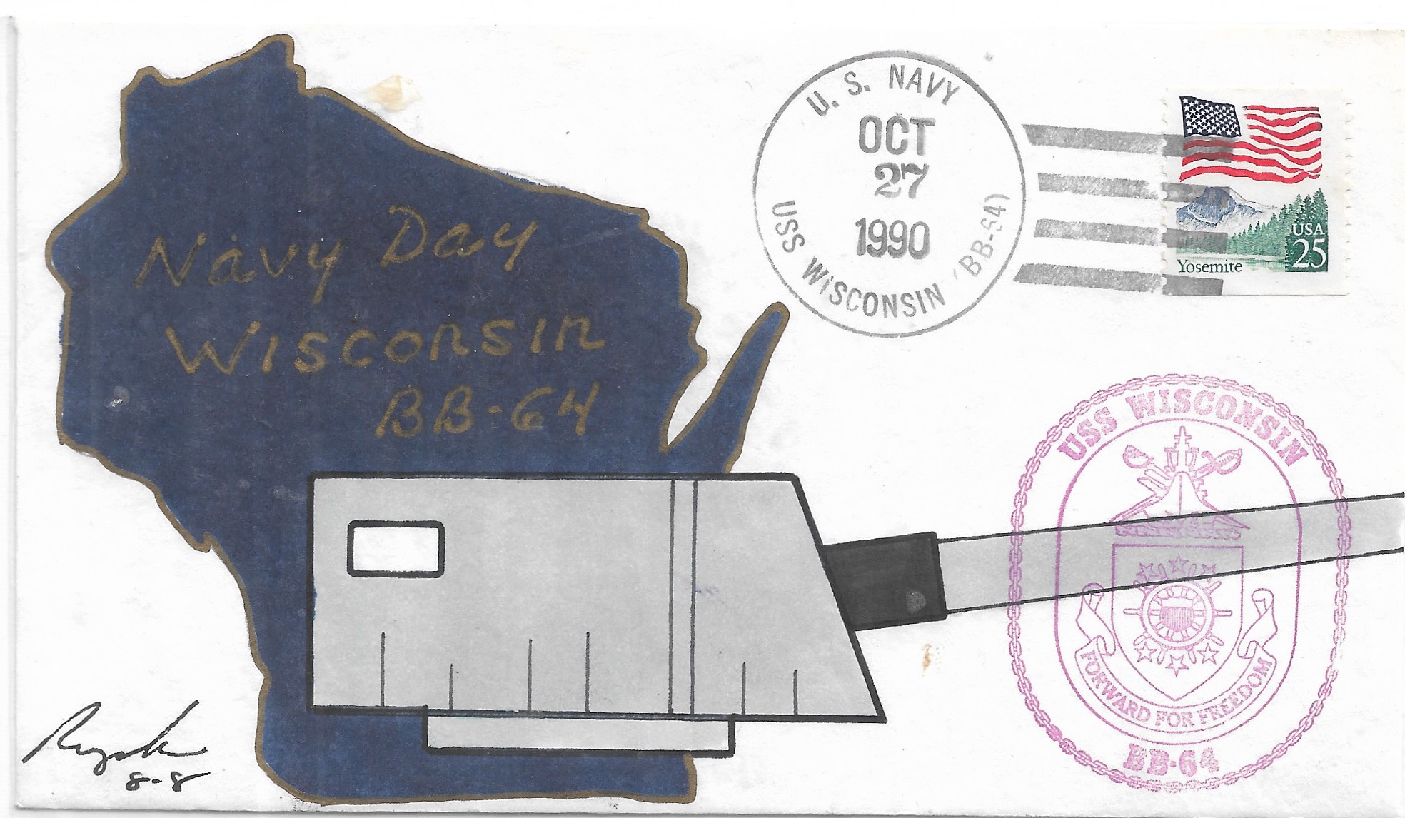 1990 USS Wisconsin BB-64, Navy Day Hand Colored cachet. Added Sunday, October 12, 2025